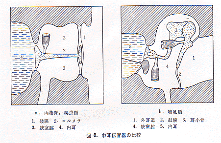両棲類とハ虫類の耳と、哺乳類の比較です。
