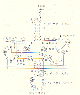 末端の3塩基は全ての、tRNAで共通で、CCA配列です。