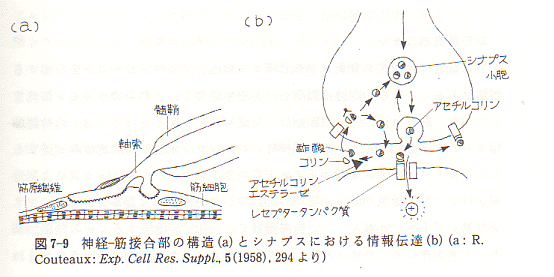 〔図〕神経−筋接合部の構造(a)とシナプスにおける情報伝達(b)
