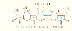 フィコビリンはシアノバクテリア(ラン藻)、紅藻に分布する色素蛋白質でフィコシアノビリンは青色色素、フィコエリトロビリンは紅色色素があります。