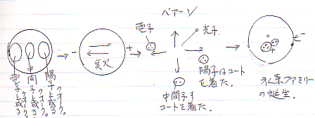 ビッグバンで、クオークはコート!を着て、電子と陽子と中間子に成りました。