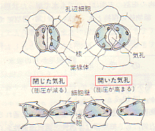 逆に、糖が水に不溶の澱粉に変えられると、浸透圧が下がり放水が起き、細胞の水が少なくなり気孔は閉じる!のですね!