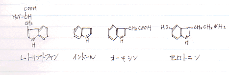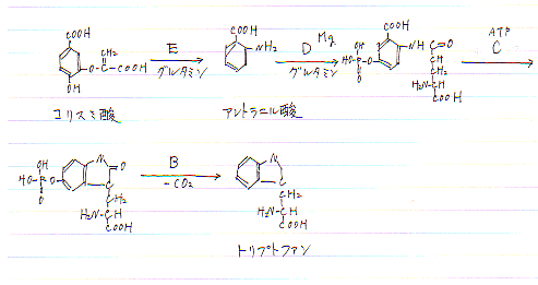 これから何段階もへてトリプトファンにたどりつく!のですけれど、その反応式が書かれていません。