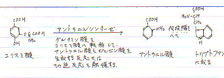 ・コリスミ酸→アントラニル酸シンターゼ(グルタミンのアミノ基をコリスミ酸に転移して、アントラニル酸を生成する反応又は、その逆反応を触媒する)→アントラニル酸→(何段階もへて)トリプトファンになる。