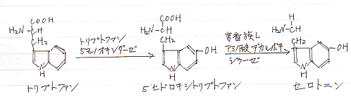 〔図〕トリプトファン→(トリプトファン5モノオキシダーゼ)→5ヒドロキシトリプトファン→(芳香族Lアミノ酸デカルボキシラーゼ)→セロトニン